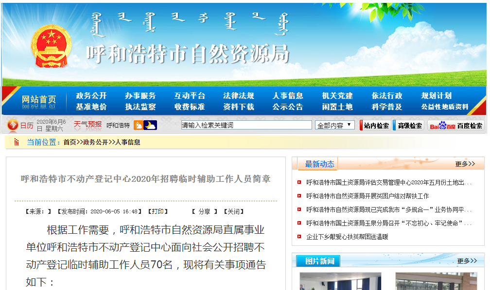 5、招聘有關(guān)信息發(fā)布網(wǎng)站:呼和浩特市自然資源局官網(wǎng)(http:// zrzyj.huhhot.gov.cn/)