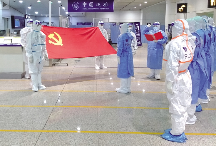 整個過程超過4個小時,防護(hù)服濕透了,過一會兒就會干;鼻子被口罩磨破了皮,墊上衛(wèi)生紙就好點;護(hù)目鏡起霧了,使點勁兒也能看得清。過去近兩個月,民警們?nèi)找箞允?,完?8架次,7215人次的入境人員邊防檢查任務(wù),累計向有關(guān)部門提供1.3萬余條相關(guān)數(shù)據(jù)……在這場沒有硝煙的戰(zhàn)役中,他們用堅守遞交了一份合格的戰(zhàn)“疫”答卷。不久前,內(nèi)蒙古邊檢總站呼和浩特邊檢站榮獲了“內(nèi)蒙古青年五四獎?wù)录w”?! ?/span>